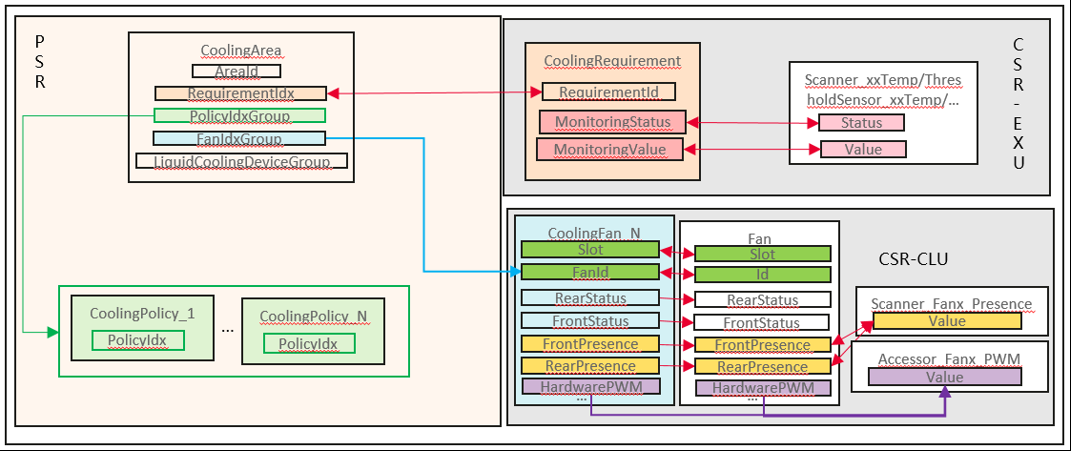 CoolingArea:用于将CoolingRequirement、CoolingPolicy、CoolingFan对象关联起来,该配置描述了,这个温度点需要哪些风扇 参与调速和关联了哪些线性调速曲线