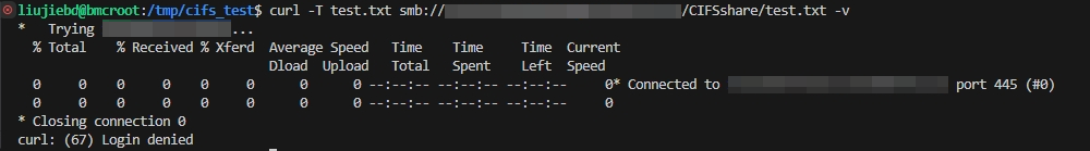 但是使用curl -T test.loh smb://CIFS服务IP/CIFSshare/test.txt --user用户名:密码 却失败,报错如下: