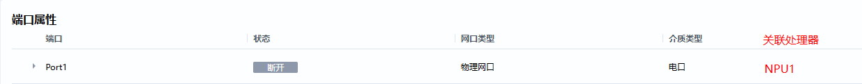 | ProcessorPorts | 新增属性 | a(sy) | 只读 R:ReadOnly | 否 | 该网口关联的处理器及其端口。数组元素的第1个参数表示处理器丝印,第2个参数表示处理器端口的逻辑ID。举例:[(“NPU1”, 0),(“NPU1”, 1)]表示该网口关联NPU1的第0、1个端口 |