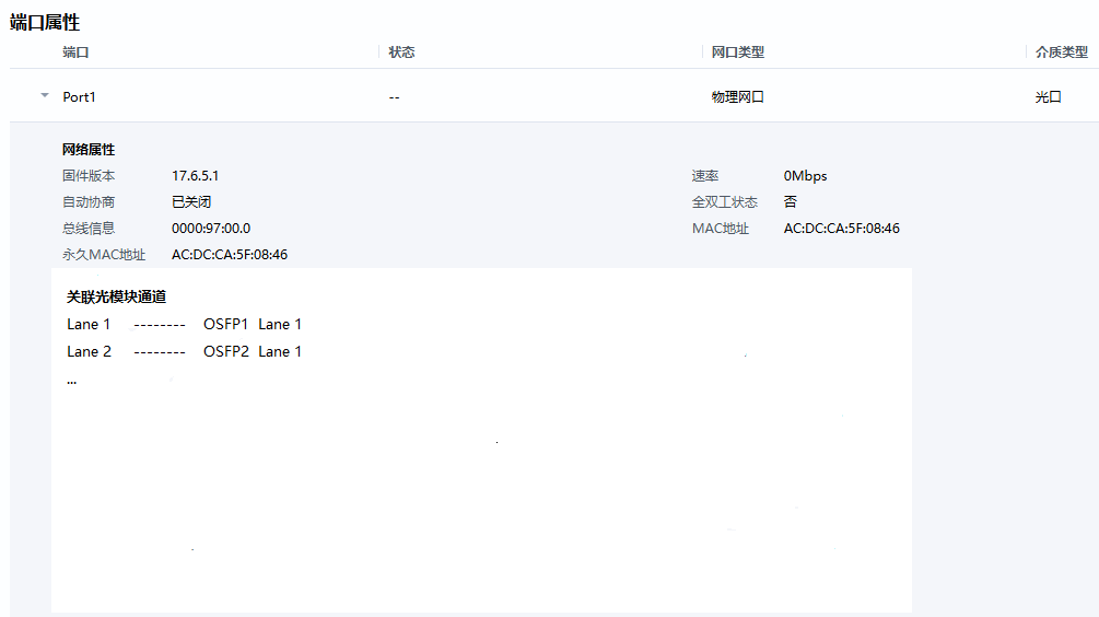 普通网卡的端口属性仍然保持完整光模块信息,NPU虚拟网卡端口属性的光模块信息只保留端口Lane与光模块Lane的关联关系