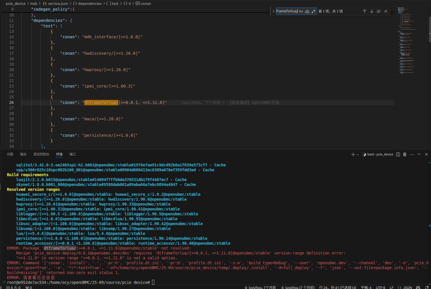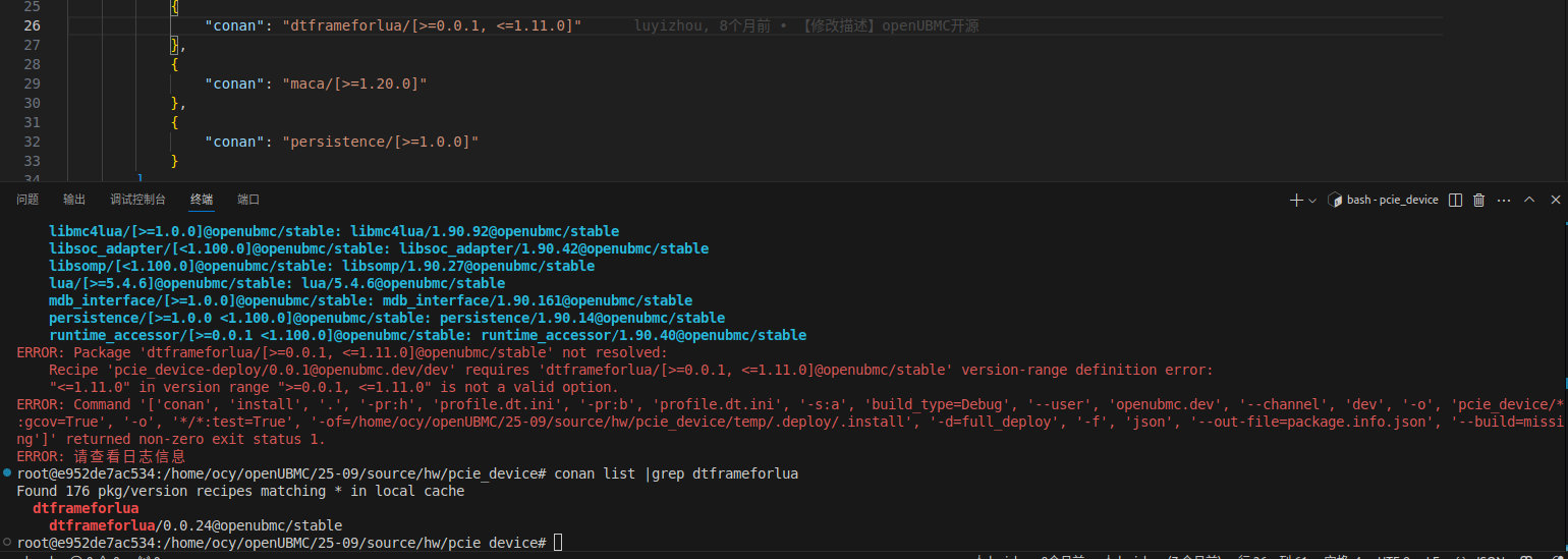 从pcie_device组件的 报错看,似乎是你的conan远端仓库缺少dtframeforlua/0.0.24@openubmc/stable包, 社区仓库是存在dtframeforlua/0.0.24@openubmc/stable的包。