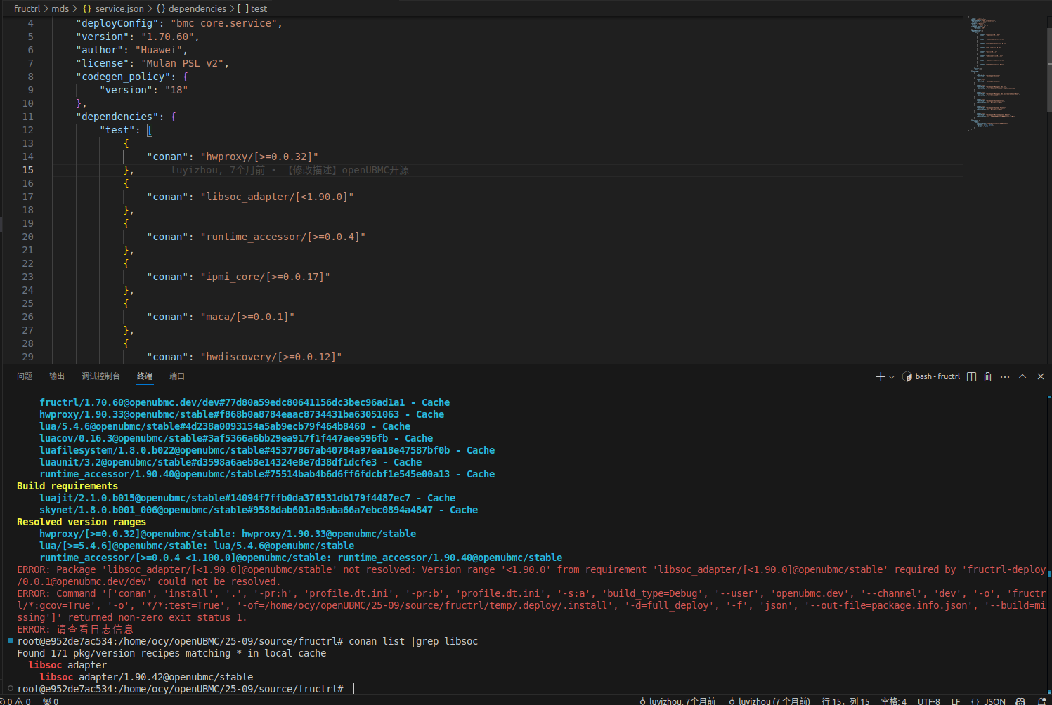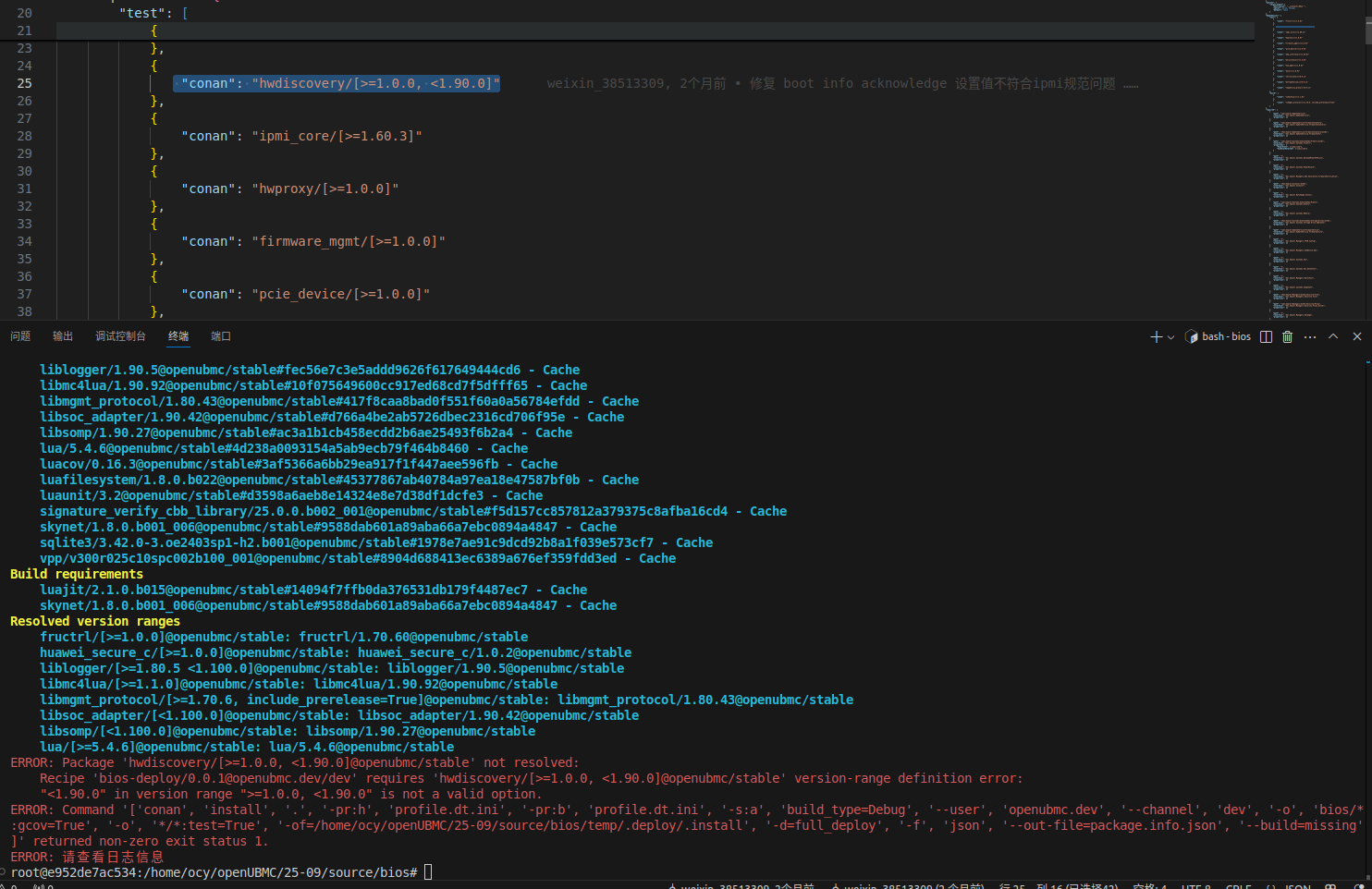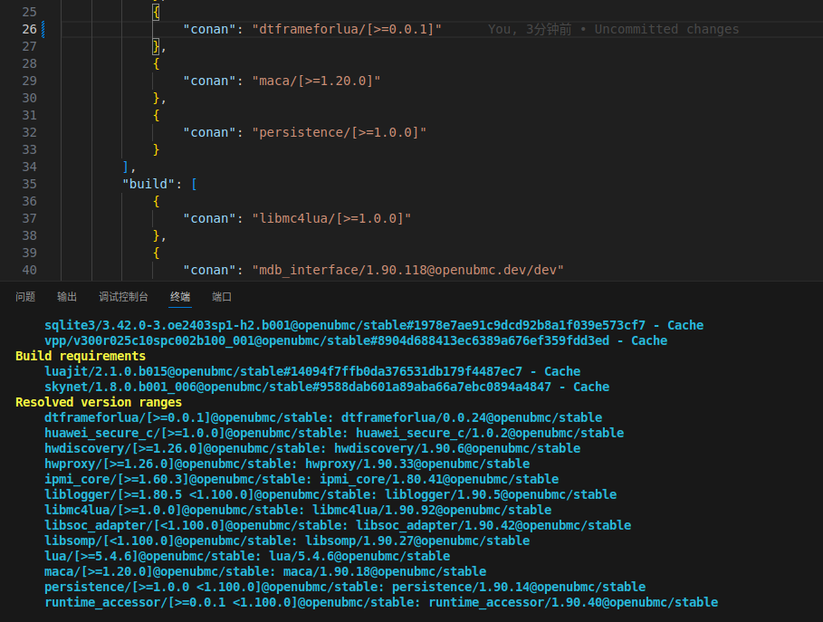 我在进行验证的时候绑定的coann远端仓库为社区的conan仓库,同时我本地确实也是存在该 dtframeforlua/0.0.24@openubmc/stable 的包,问题是出现在pcie_device/mds/service.json配置文件中对组件版本定义这里,当我将"conan": "dtframeforlua/[>=0.0.1, <=1.11.0]“修改为"conan”: "dtframeforlua/[>=0.0.1]"是能够成功执行bingo test -ut -it -cov -jit,通过观察GitCode - 全球开发者的开源社区,开源代码托管平台 PR确实不会有相关的报错,还不清楚这里面的差异