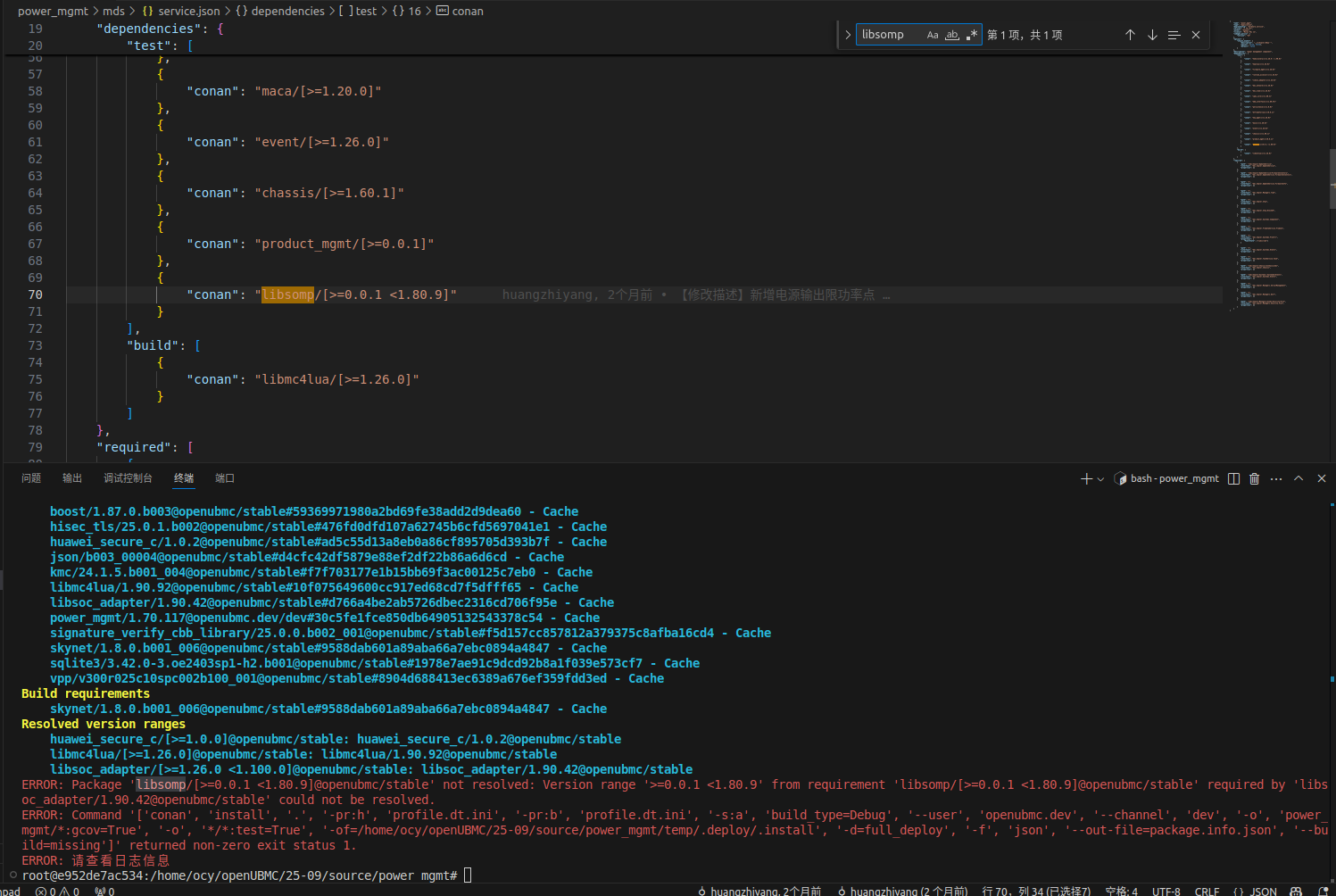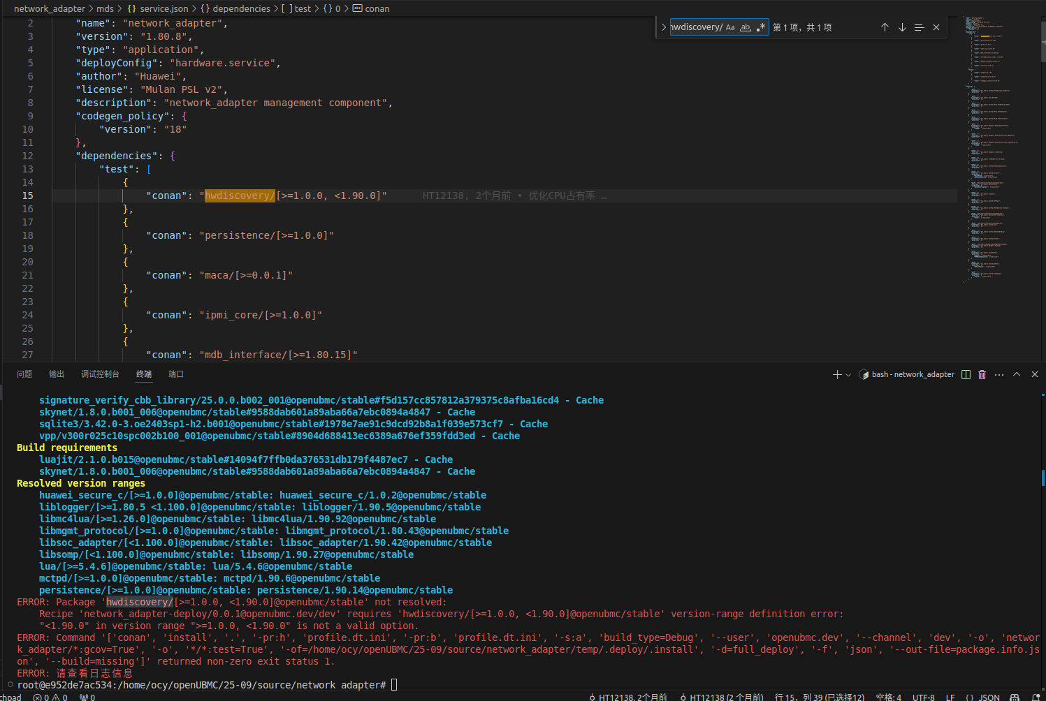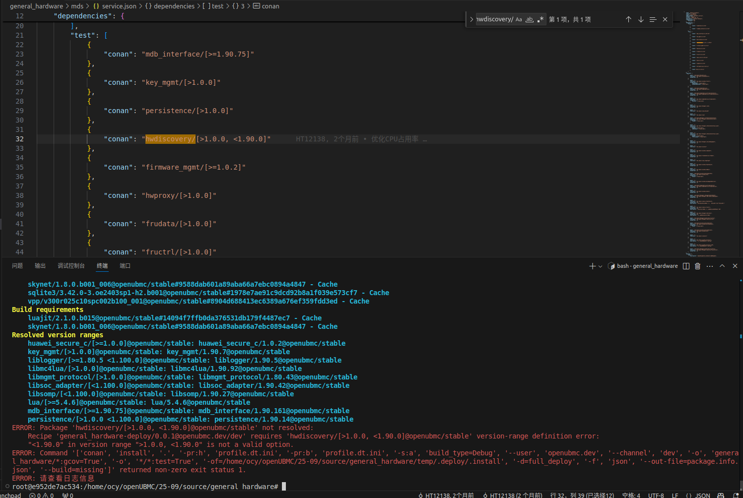 我在进行验证的时候绑定的coann远端仓库为社区的conan仓库,同时我本地确实也是存在该 dtframeforlua/0.0.24@openubmc/stable 的包,问题是出现在pcie_device/mds/service.json配置文件中对组件版本定义这里,当我将"conan": "dtframeforlua/[>=0.0.1, <=1.11.0]“修改为"conan”: "dtframeforlua/[>=0.0.1]"是能够成功执行bingo test -ut -it -cov -jit,通过观察GitCode - 全球开发者的开源社区,开源代码托管平台 PR确实不会有相关的报错,还不清楚这里面的差异