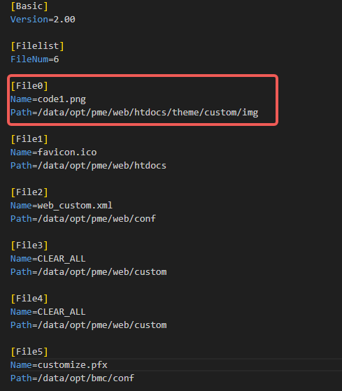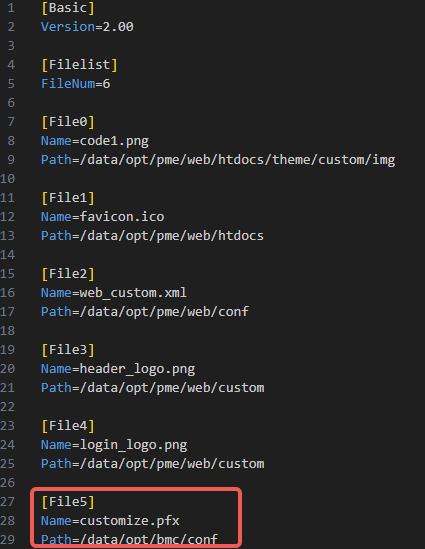 需要正确配置文件数量、文件名称和文件路径。其中文件路径和文件名称是固定的,不允许进行变更,FileNum的值需要与下列配置File的个数一致,具体配置参考下面示例