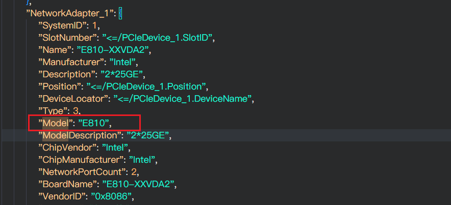 常规适配网卡时,我们可根据 network_adapter/src/lualib/hardware_config 下支持的协议进行 SR 文件适配即可, 需要关注 SR 中NetworkAdapter(网卡类)中的 Model属性,即芯片型号,芯片型号决定了该网卡支持哪些协议 , 框架会根据 NetworkAdapter 的 Model 属性加载对应的 network_adapter/src/lualib/hardware_config 下的协议配置文件, 例如: 配置 Model 为 E810 即加载对应的 network_adapter/src/lualib/hardware_config/E810.lua 文件;
