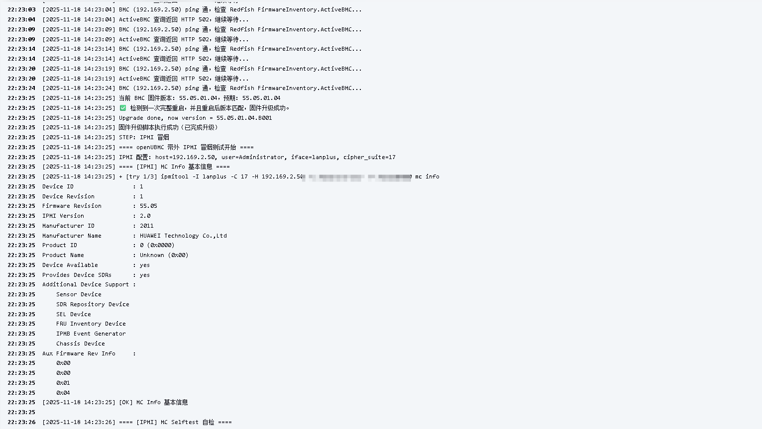 log "MODE=all:本次固件已是最新版本,跳过 IPMI / Redfish 冒烟。"