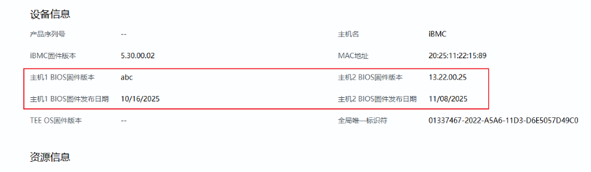 1、同意首页->设备信息处适配双主机BIOS版本显示(显示效果参见评审点描述)。BIOS板子信息集中到下方,与其他信息不需要通过线条分割,同一主机的固件版本和固件发布日期始终保持水平对齐