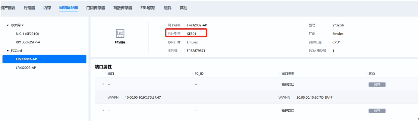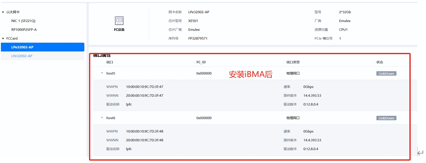 LPe32002-AP HBA FC卡的芯片型号在S920X20机型上装IBMA的情况下会显示FC信息,停止IBMA服务后不会显示网卡端口、FC_ID、状态信息查看相关贴发现已经支持了FC卡的带外信息管理。