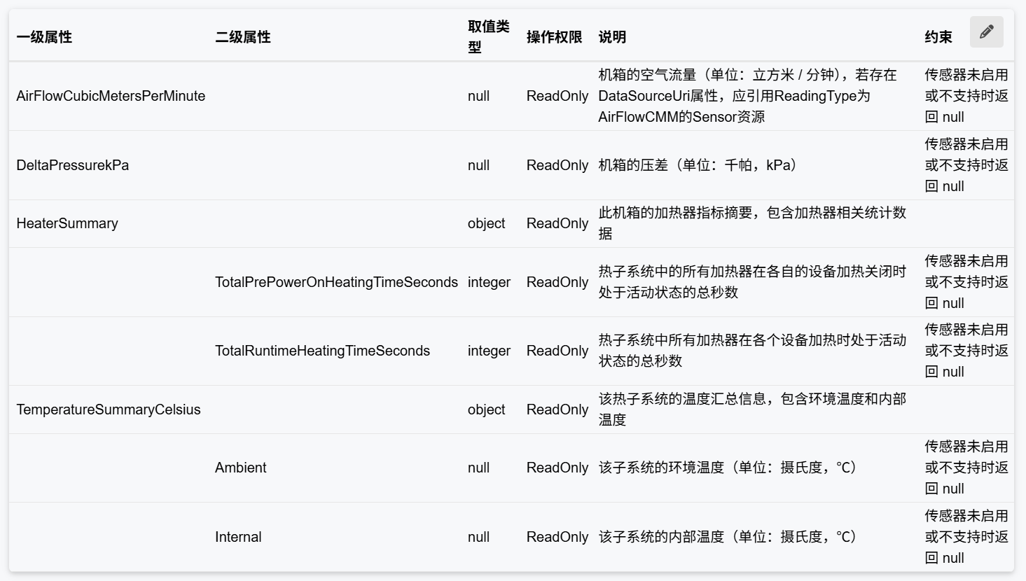 | TotalRuntimeHeatingTimeSeconds | integer | ReadOnly | 热子系统中所有加热器在各个设备加热时处于活动状态的总秒数 | 传感器未启用或不支持时返回 null | |