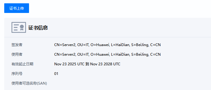 subject=C = CN, ST = GuangDong, L = ShenZhen, O = Huawei, OU = IT, CN = ServerDomain issuer=C = CN, ST = GuangDong, L = ShenZhen, O = Huawei, OU = IT, CN = ServerDomain