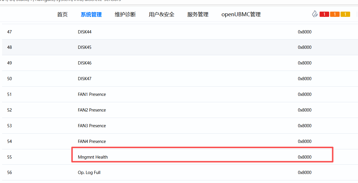 在openUBMC,是通过mdbctl setprop修改Scanner中Value值,达到触发告警的目的。Mngmnt Health是离散传感器,对应的离散告警为可参考ipmi协议514页,当sensor 无法正常访问,读值异常才会触发告警。