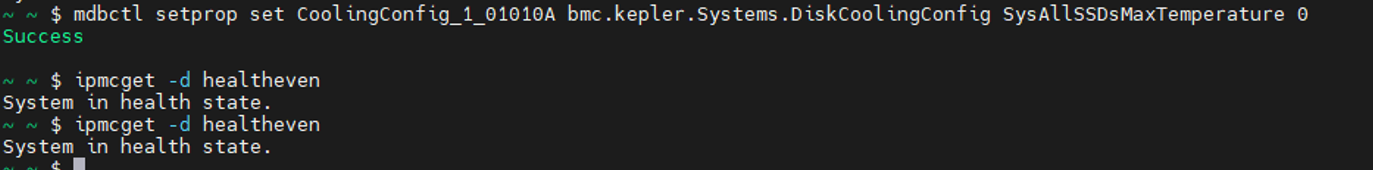 用setprop命令设置硬盘温度为0,模拟触发告警。查看BMC状态,还是健康,没有记录相应的告警