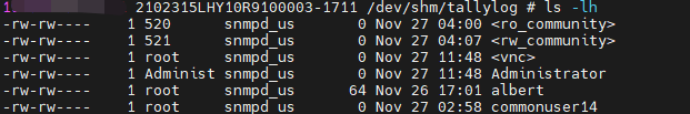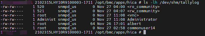 ls -lh /dev/shm/tallylog查看目录下 是否有test文件,反馈下截图。ls -lh /dev/shm/tallylog查看目录下 是否有test文件,反馈下截图。从你的反馈来看,是不是BMC重启后,使用手动调用snmpget 接口 可以认证成功。 通过自动化脚本跑测试的时候,触发了这个认证失败。