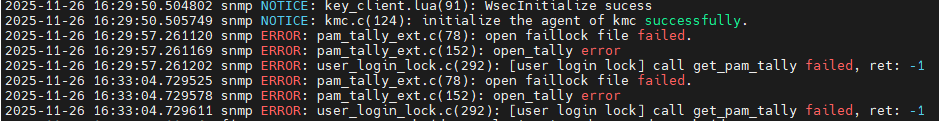 pam_tally)因无法打开/var/log/faillog文件而崩溃,导致 SNMPv3 认证流程被提前终止。