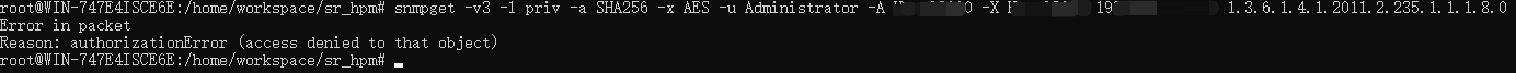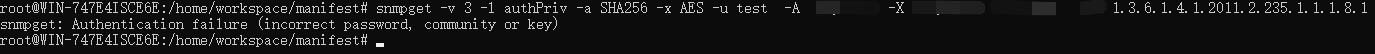 发送命令:snmpget -v 3 -l authPriv -a SHA256 -x AES -u test -A -X 1.3.6.1.4.1.2011.2.235.1.1.1.8.0