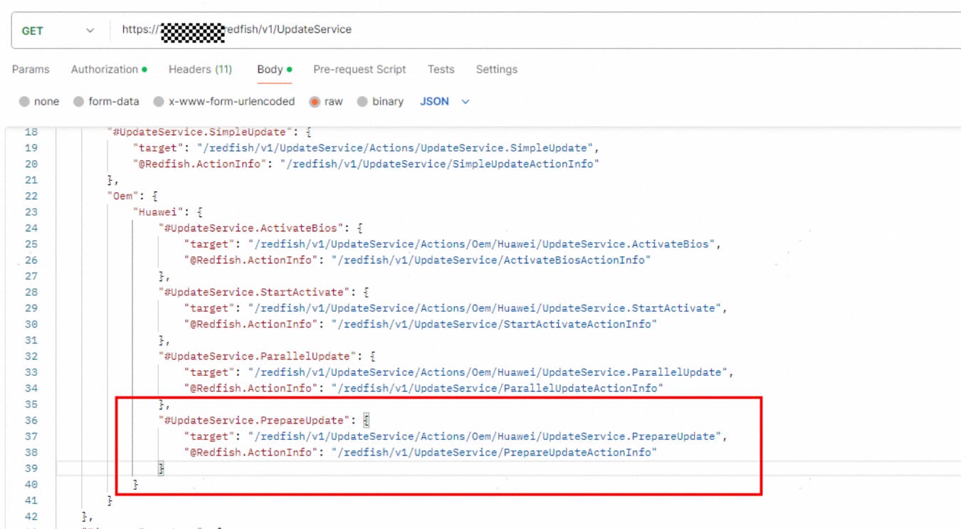 URI: /redfish/v1/UpdateService/Actions/Oem/{{OemIdentifier}}/UpdateService.PrepareUpdate