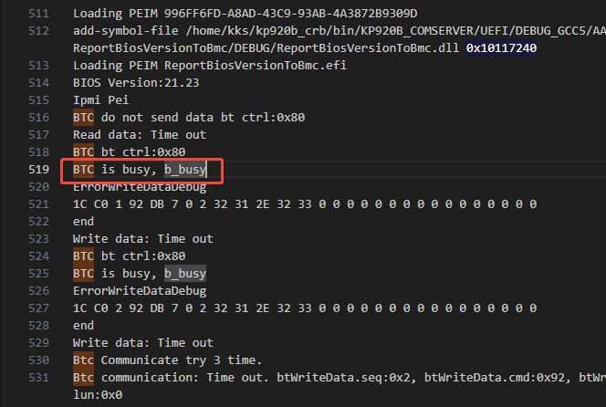 问题描述:遇到bios无法启动,查看串口日志发现bt通道异常打印BTC is busy, b_busy