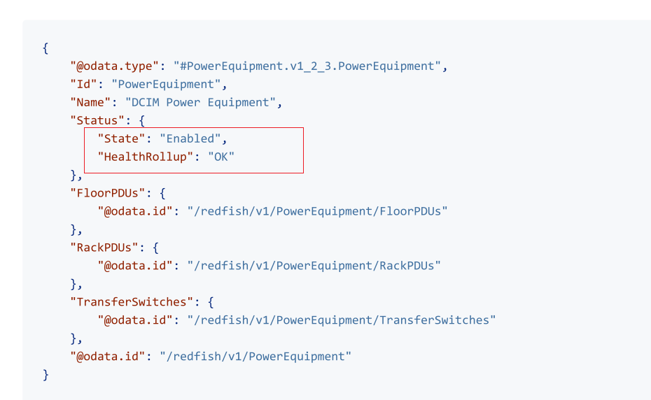 1.同意新增PowerEquipment资源,URI:/redfish/v1/PowerEquipment,GET响应包含属性@odata.context,@odata.id,@odata.type,Id,Name,Status,Links一级PowerShelves的链接。