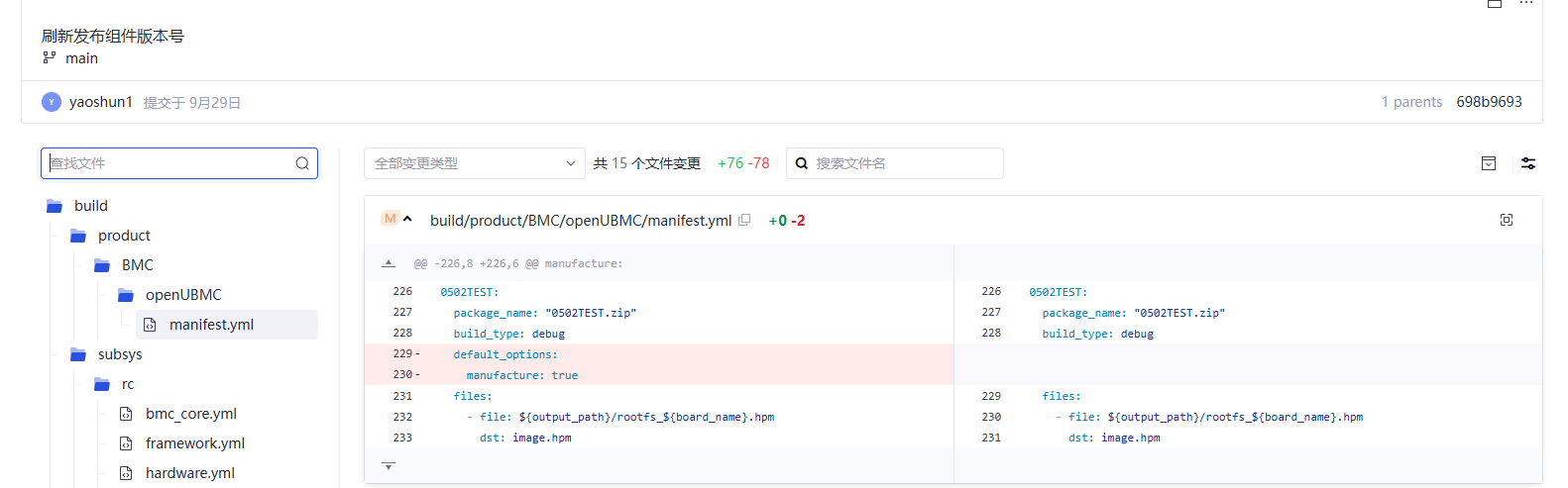 在manifest目录执行bin go build 命令,参数为-t publish -b openUBMC -bt debug --stage stable -z 0502TEST 命令构建装备版本的包