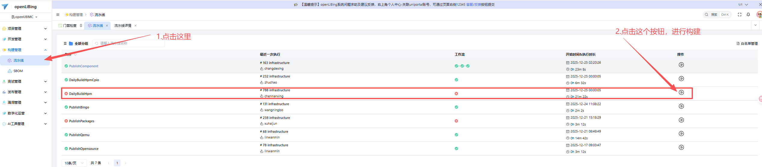 构建管理——>流水线——>DailyBuildHpm——>执行