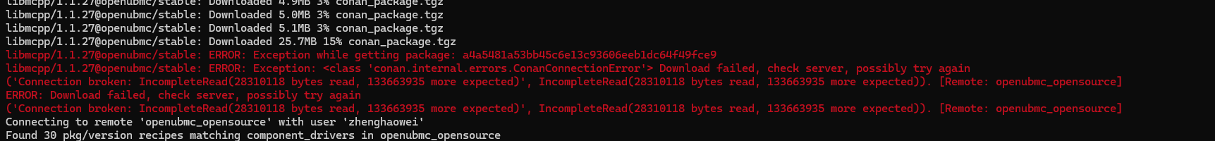 感谢,排查了一下原因,可能是因为之前还在使用https://conan.openubmc.cn/conan_1 的地址,执行过编译,带了更高版本的缓存,通过conan remove libmc4lua/1.100.71@openubmc/stable 和conan remove libmgmt_protocol/1.80.64@openubmc/stable可以正常编译2509版本,直接运行conan remove ‘*‘会导致全部缓存会全部清除需要重新导入,建议还是单独清除过高版本组件缓存。