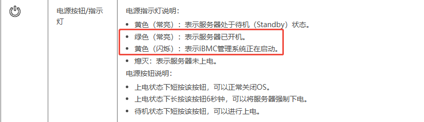 绿色常亮灯表示整个系统的运行状态(包括 OS 正常运行),此状态由 BMC 通过与 OS 侧的 iBMA 服务交互确认后,再通过 SMC 或直接通过 I2C 命令通知 CPLD 实现点灯。
