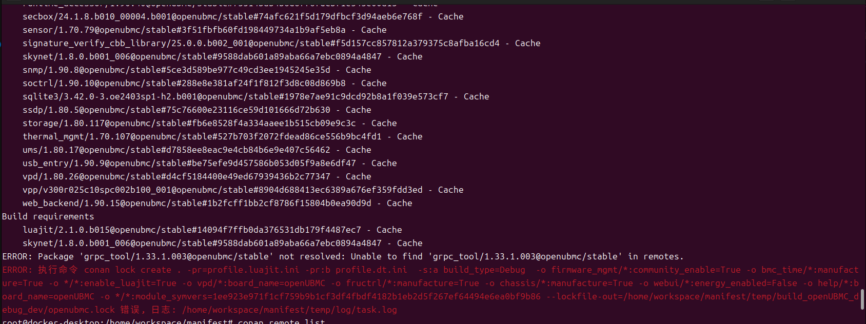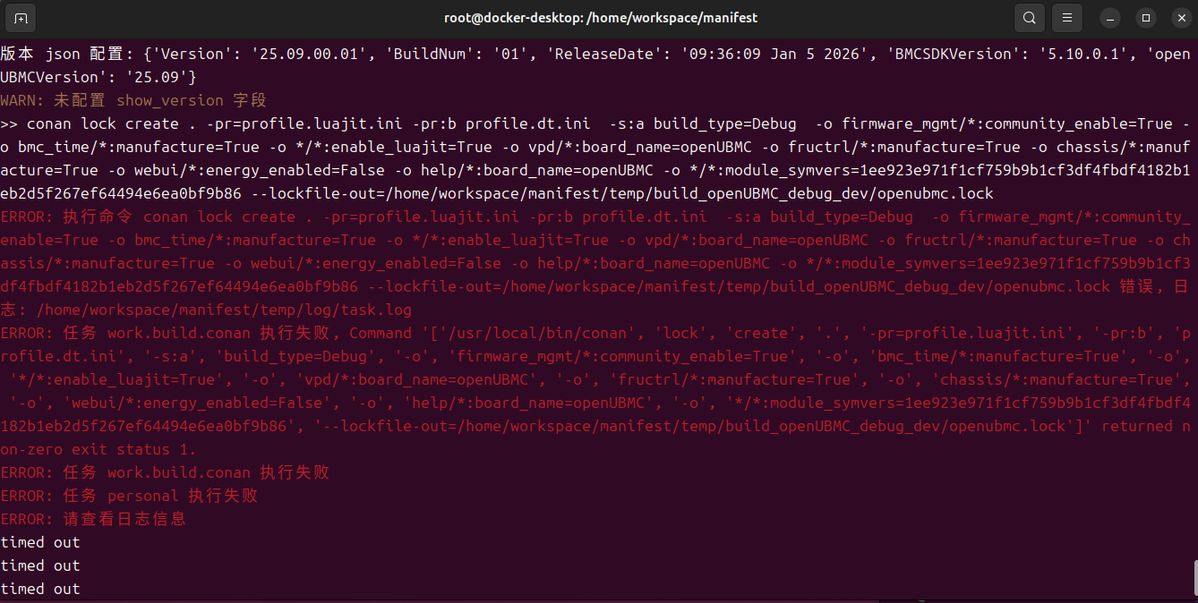 ERROR: 执行命令 conan lock create . -pr=profile.luajit.ini -pr:b profile.dt.ini -s:a build_type=Debug -o firmware_mgmt/:community_enable=True -o bmc_time/:manufacture=True -o /:enable_luajit=True -o vpd/:board_name=openUBMC -o fructrl/:manufacture=True -o chassis/:manufacture=True -o webui/:energy_enabled=False -o help/:board_name=openUBMC -o /:module_symvers=1ee923e971f1cf759b9b1cf3df4fbdf4182b1eb2d5f267ef64494e6ea0bf9b86 --lockfile-out=/home/workspace/manifest/temp/build_openUBMC_debug_dev/openubmc.lock 错误, 日志: /home/workspace/manifest/temp/log/task.log