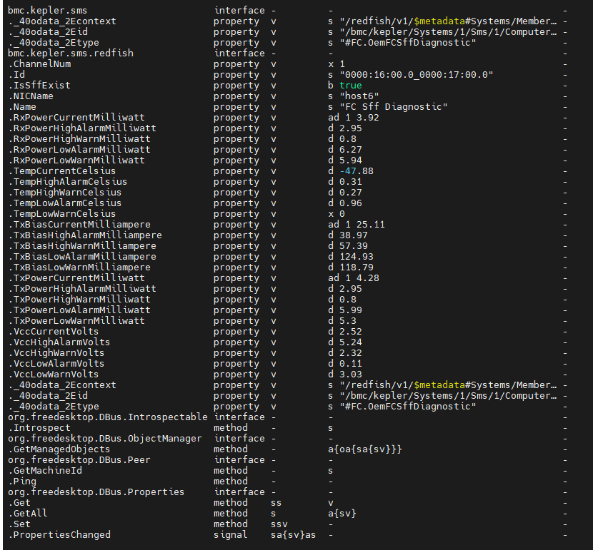 busctl 查看以下资源:/bmc/kepler/Systems/1/Sms/1/ComputerSystem/Systems/1/Storage/1/FC/0000_3A16_3A00_2E0_5F0000_3A17_3A00_2E0/Sff/Diagnostic