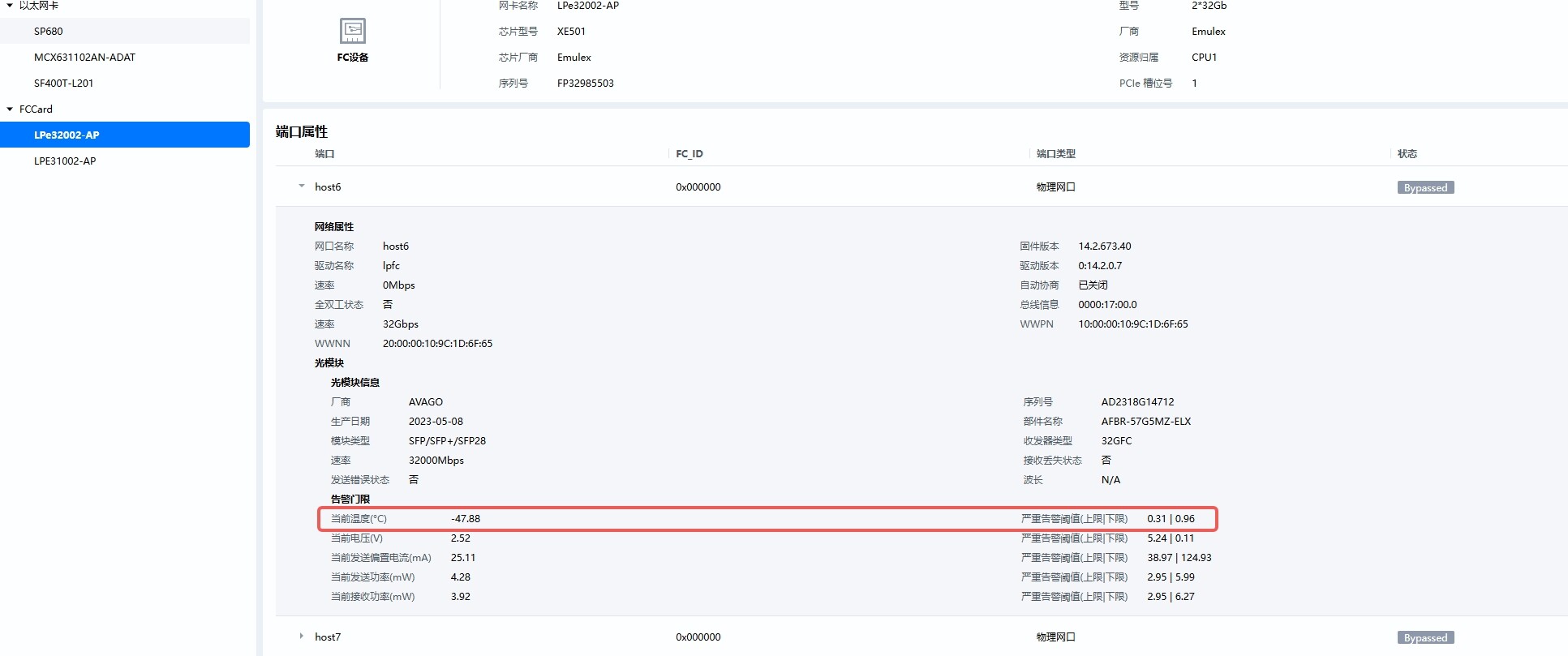 查看FC卡信息,发现光模块信息显示不太对劲: