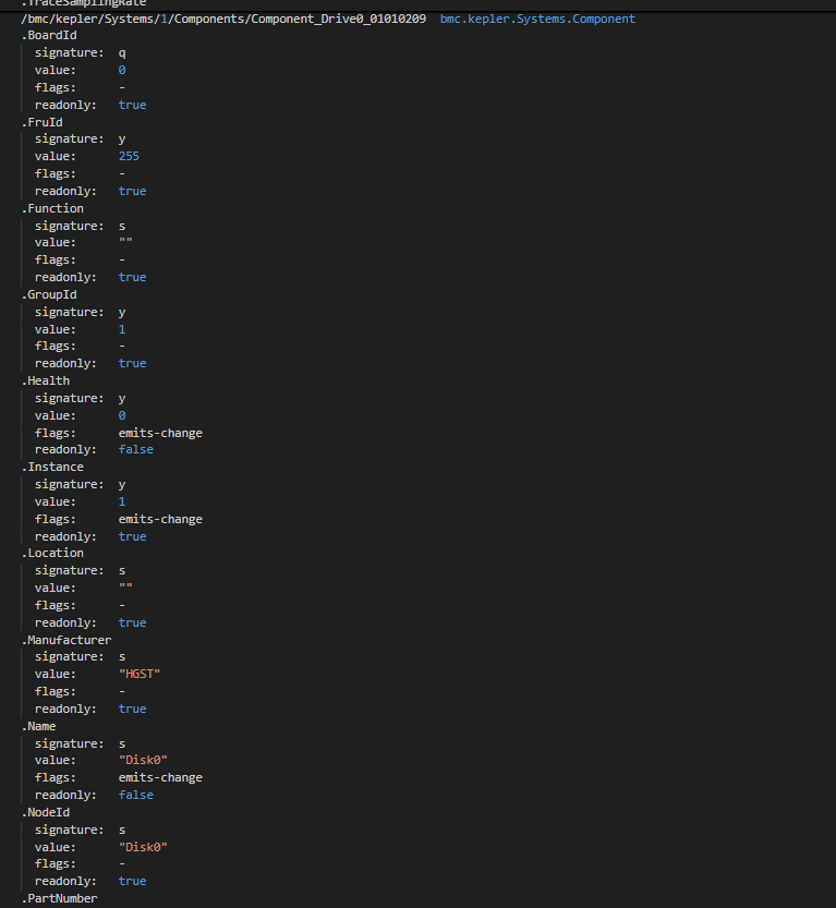 busctl introspect bmc.kepler.Systems.Component /bmc/kepler/Systems/1/Components/Component_Drive0_01010209