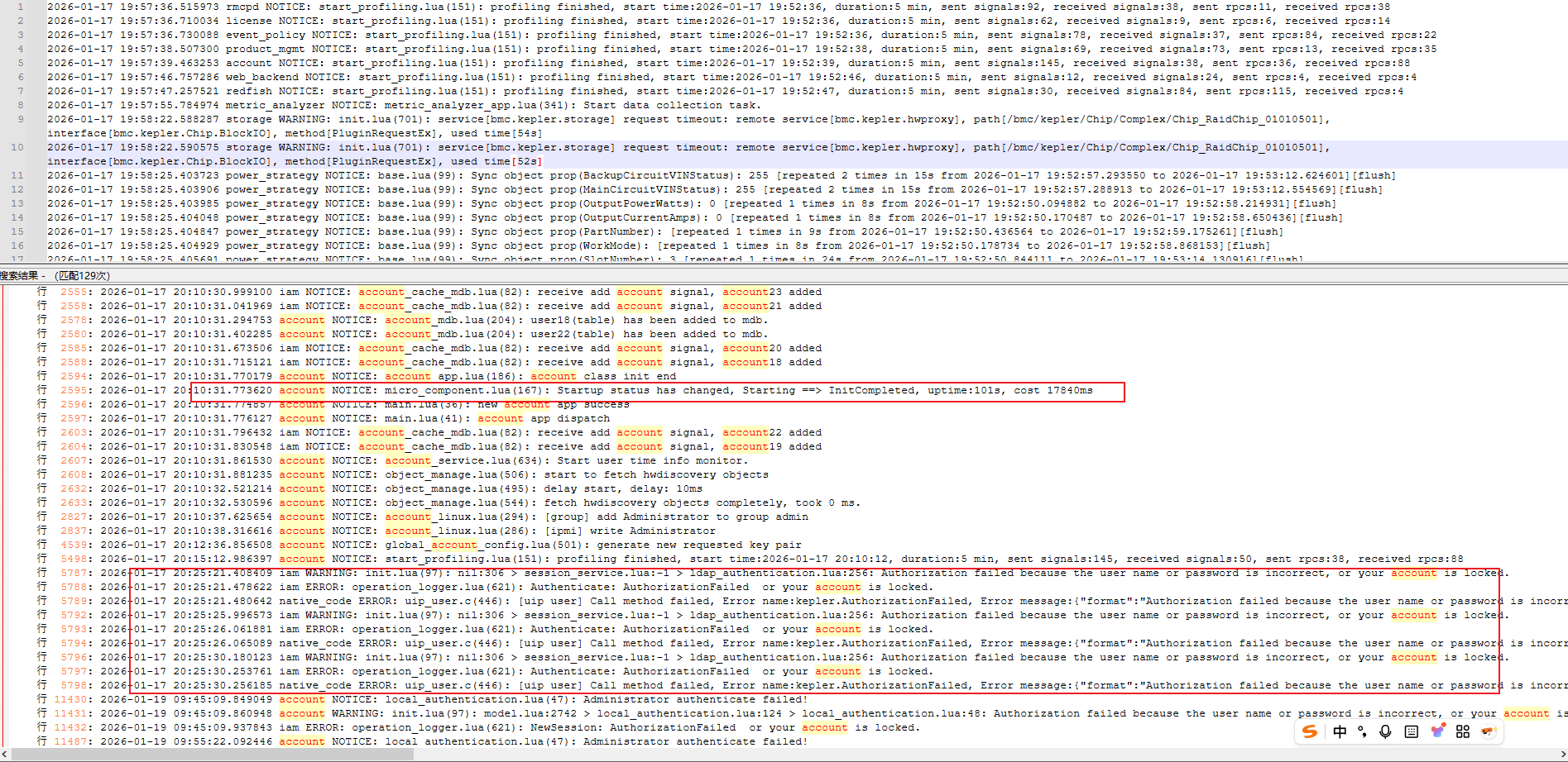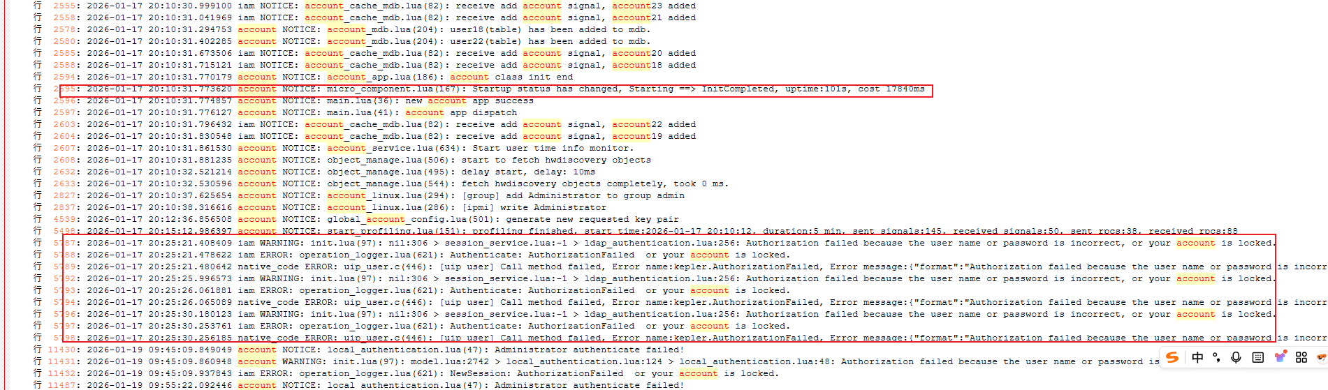 2026-01-17 20:25:30.256185 native_code ERROR: uip_user.c(446): [uip user] Call method failed, Error name:kepler.AuthorizationFailed, Error message:{“format”:“Authorization failed because the user name or password is incorrect, or your account is locked.”,“name”:“AuthorizationFailed”,“registry_prefix”:“openUBMC”}.