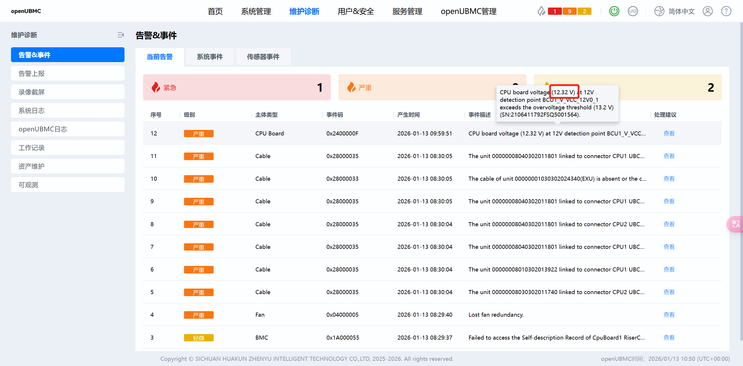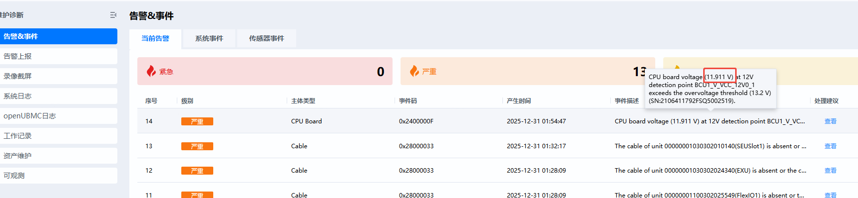 告警事件描述显示 :CPU board voltage (11.911 V) ... exceeds the overvoltage threshold (13.2 V),其中电压值 11.911 V 明显低于传感器页面的 15 V,且逻辑矛盾(11.911 < 13.2 实际未超限)。