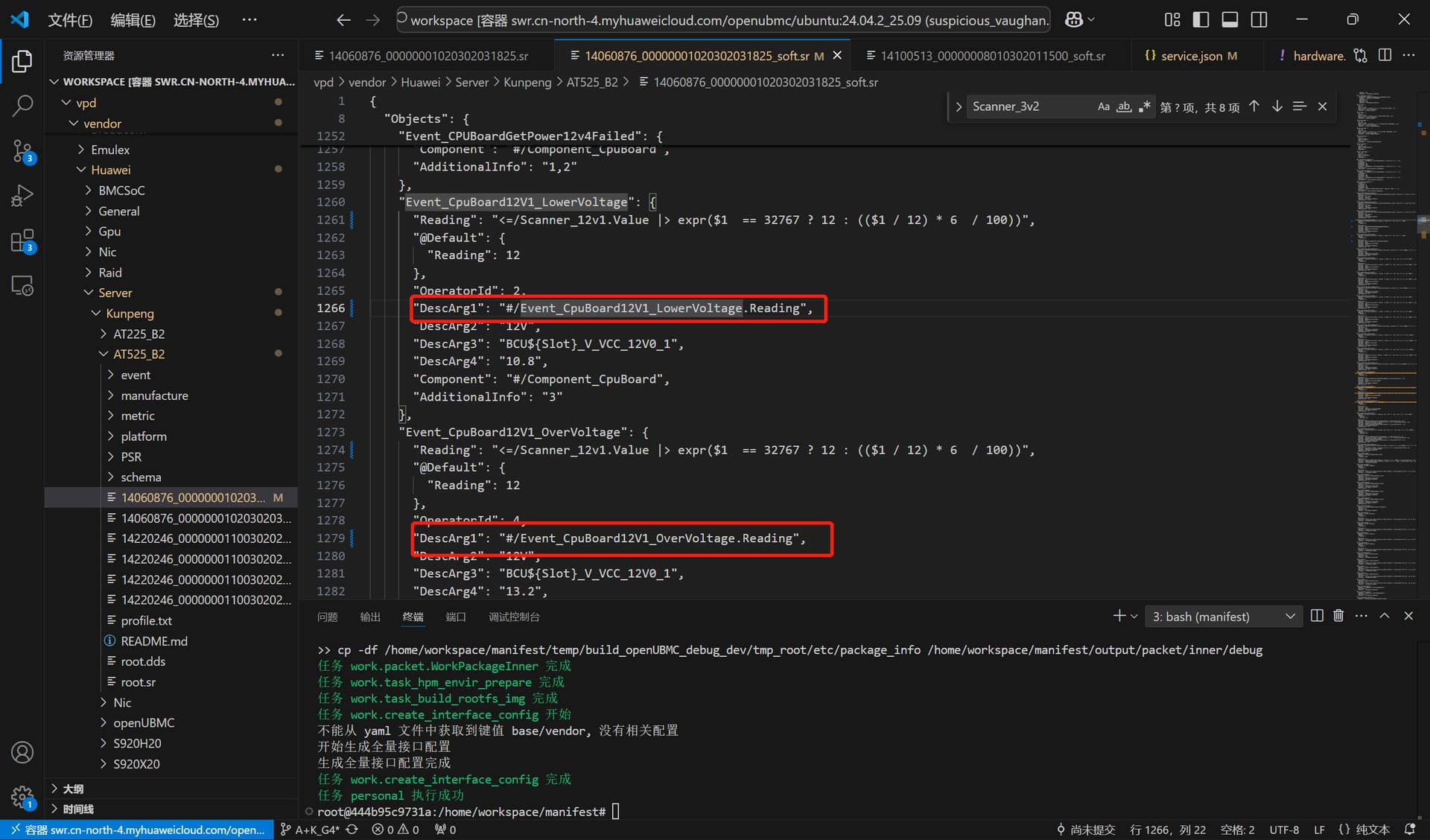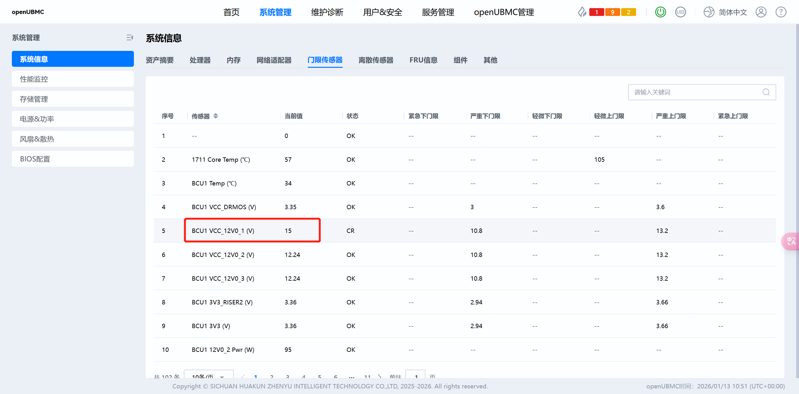 在 OpenUBMC 2509 系统中,当通过命令模拟 BCU1 VCC_12V0_1 (V) 电压传感器超限告警时,出现 门限传感器界面显示的当前值 与 告警事件详情中描述的实际测量值 不一致的现象: