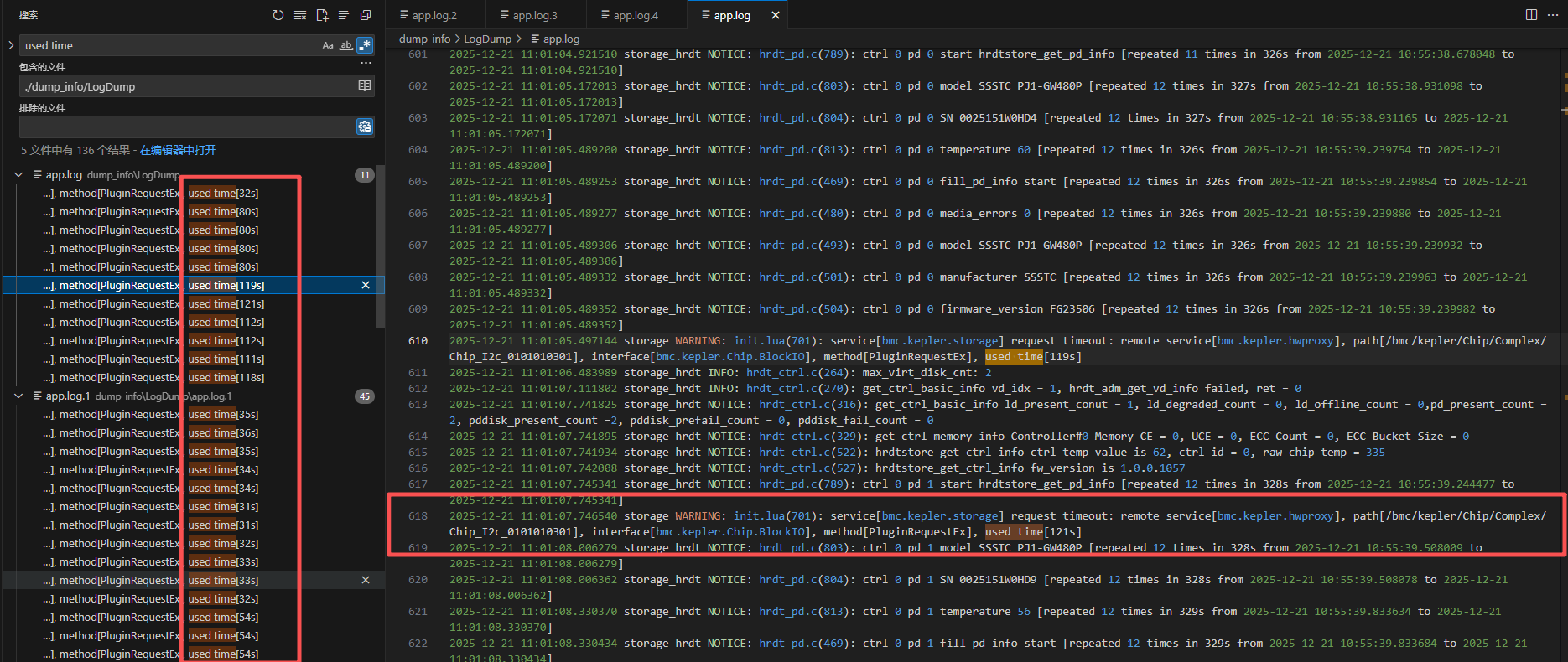 日志中已出现 >100s 的 PluginRequestEx 超时,表明Hisport I²C链路存在严重阻塞 |