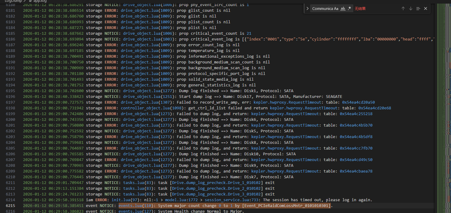 2026-01-12 06:29:00.742406 storage ERROR: drive_object.lua(1273): failed to dump log, and return: kepler.hwproxy.RequestTimeout: table: 0x54ea4cd255218