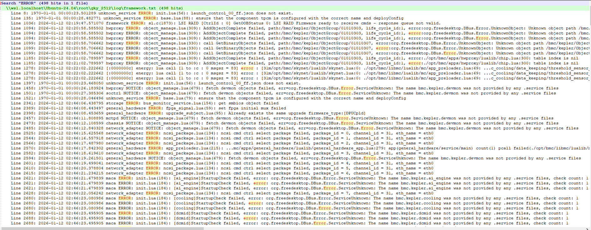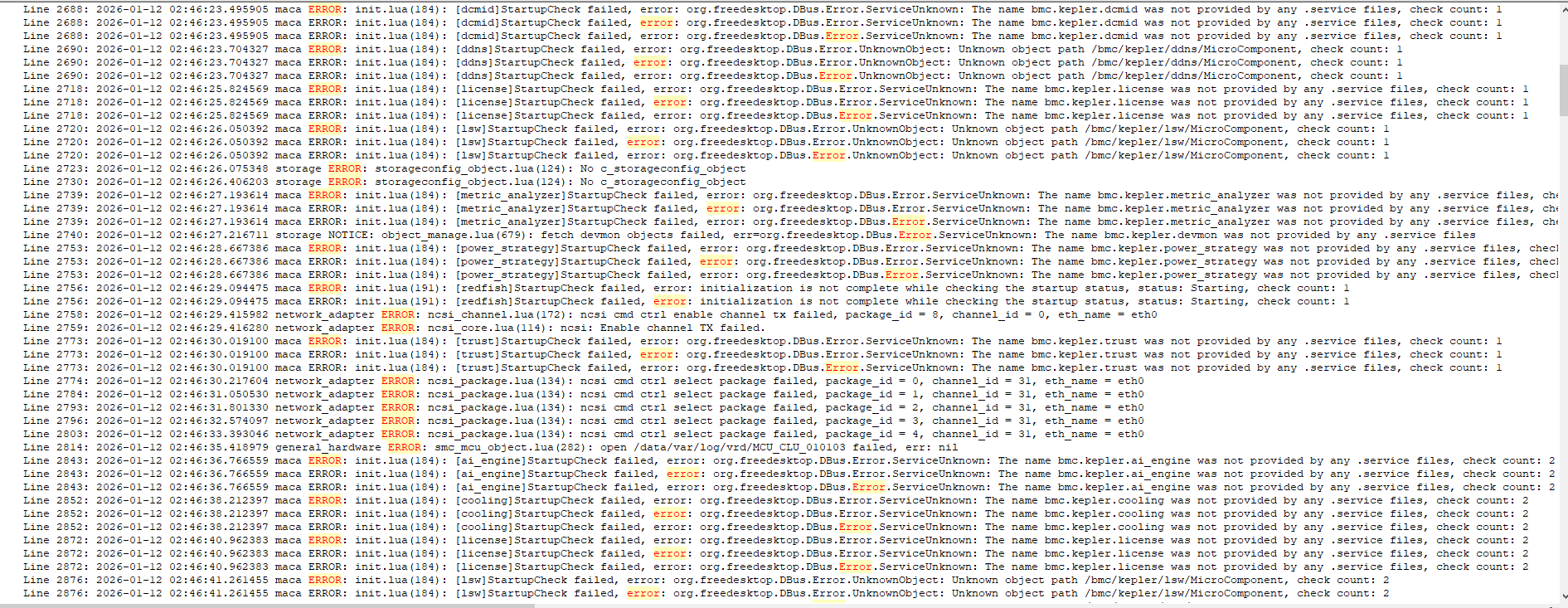 bmc.kepler.ai_engine的 D-Bus 服务,但该服务未在系统中注册。 init.lua是系统初始化脚本,其中的StartupCheck模块会检查各个服务是否已成功注册到 D-Bus。- 此类错误反复出现在多个组件(如