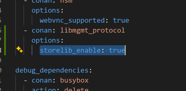 manifest.yaml文件,在libmgmt_protocol下增加配置:- conan: libmgmt_protocol options: storelib_enable: true