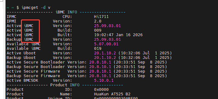 结合截图中的命令输出 ipmcget -d v 显示 Active iBMC Version: 25.09.03.01,说明系统当前运行的激活固件分区中的代码实为 iBMC 风格的构建版本,尽管它可能基于 OpenUBMC 25.09 源码编译。