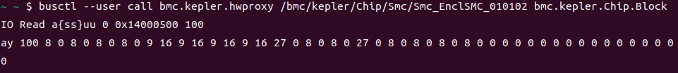 busctl --user call bmc.kepler.hwproxy /bmc/kepler/Chip/Smc/Smc_EnclSMC_010102 bmc.kepler.Chip.BlockIO Read a{ss}uu 0 0x14000500 100