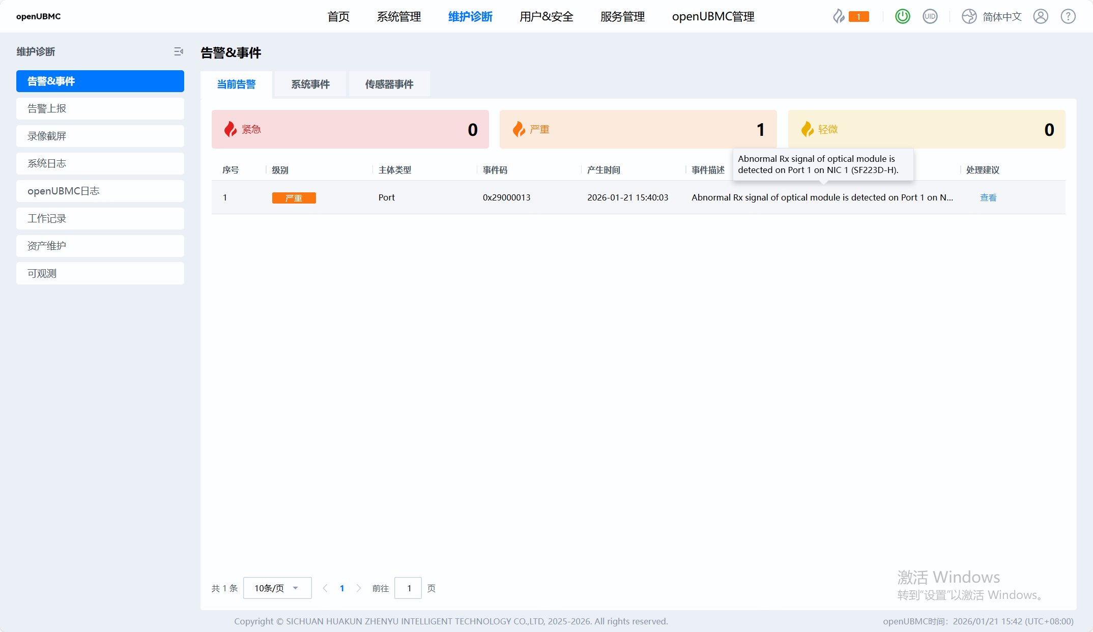 当网卡光模块被物理拔出后,系统中对应的光模块对象信息仍然显示为“在位”(Presence=1),并且之前因无光纤连接触发的告警未能自动清除。