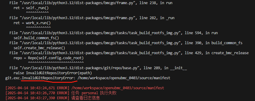 清理temp和output后,不再报InvalidGitRepositoryError,但是还有其他错(https://forum.openubmc.cn/t/topic/445),不在此处讨论
