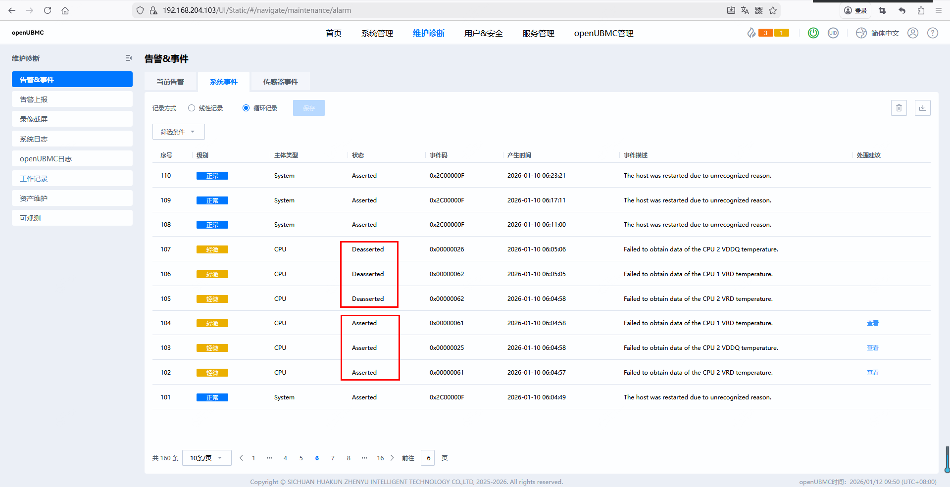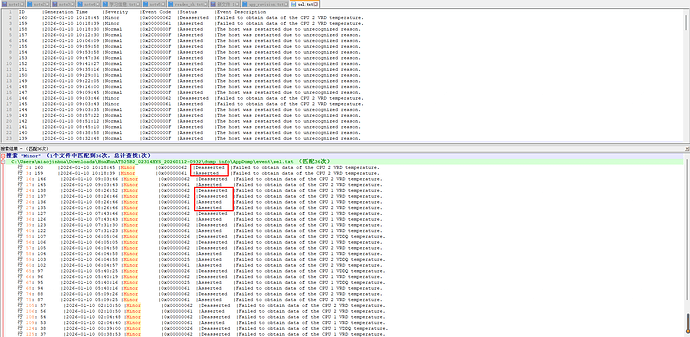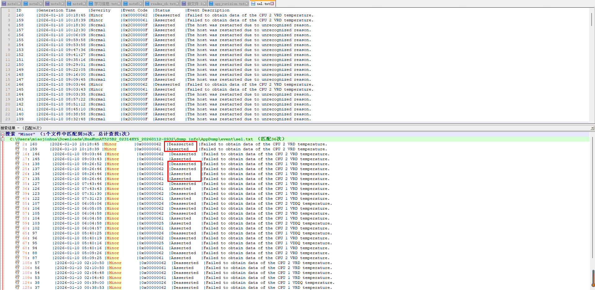 在执行 reboot 指令后,系统启动过程中,BMC 日志中短暂出现 CPU VRD(Voltage Regulator Device)和 VDDQ 温度读取失败的“轻微”级别告警。这些告警随后被自动消除(Deasserted),但在事件日志中仍被记录。