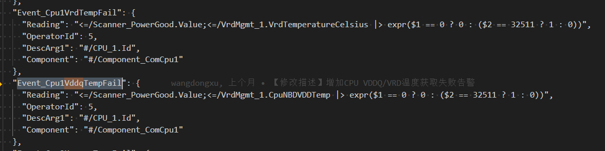 CpuDDRVddqTempCpuNBDVDDTempVrdMgmt 对象下的温度参数,监控 CPU 内存供电模块的温度。VrdMgmt 类定义了这些属性。从提供的 JSON 片段可见,已尝试通过增加 PowerGood 判断 修改事件触发条件: