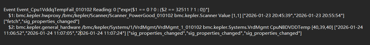 2026-01-24 04:21:08.866263 event NOTICE: hardware_event.lua(580): Event_Cpu1VddqTempFail_010102|{“source”:{“expressions”:[“expr($1 == 0 ? 0 : ($2 == 32511 ? 1 : 0))”],“properties”:[{“Property”:“Value”,“Interface”:“bmc.kepler.Scanner”,“Path”:“/bmc/kepler/Scanner/Scanner_PowerGood_010102”,“Service”:“bmc.kepler.hwproxy”},{“Property”:“CpuNBDVDDTemp”,“Interface”:“bmc.kepler.Systems.VrdMgmt”,“Path”:“/bmc/kepler/Systems/1/VrdMgmt/VrdMgmt_1_010102”,“Service”:“bmc.kepler.general_hardware”}]},“value”:[1,32511],“type”:“synchronization”}