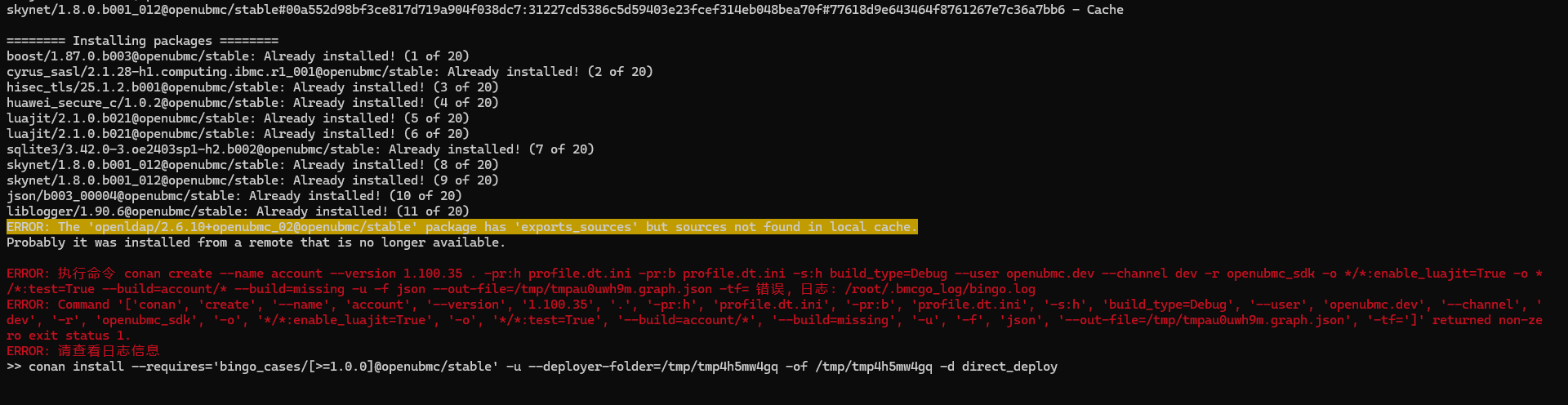 ERROR: The 'openldap/2.6.10+openubmc_02@openubmc/stable' package has 'exports_sources' but sources not found in local cache.