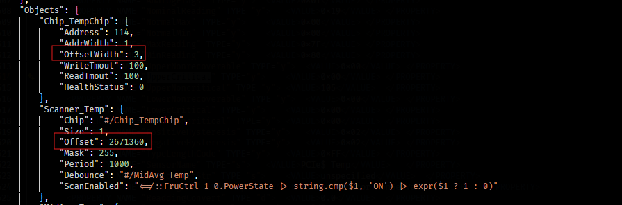 如果传感器要求偏移地址为0x290000(即十进制2,686,976),您可以设置:"Scanner_Temp": { "Chip": "#/Chip_TempChip", "Offset": 2686976, "Size": 1, "Period": 1000 }