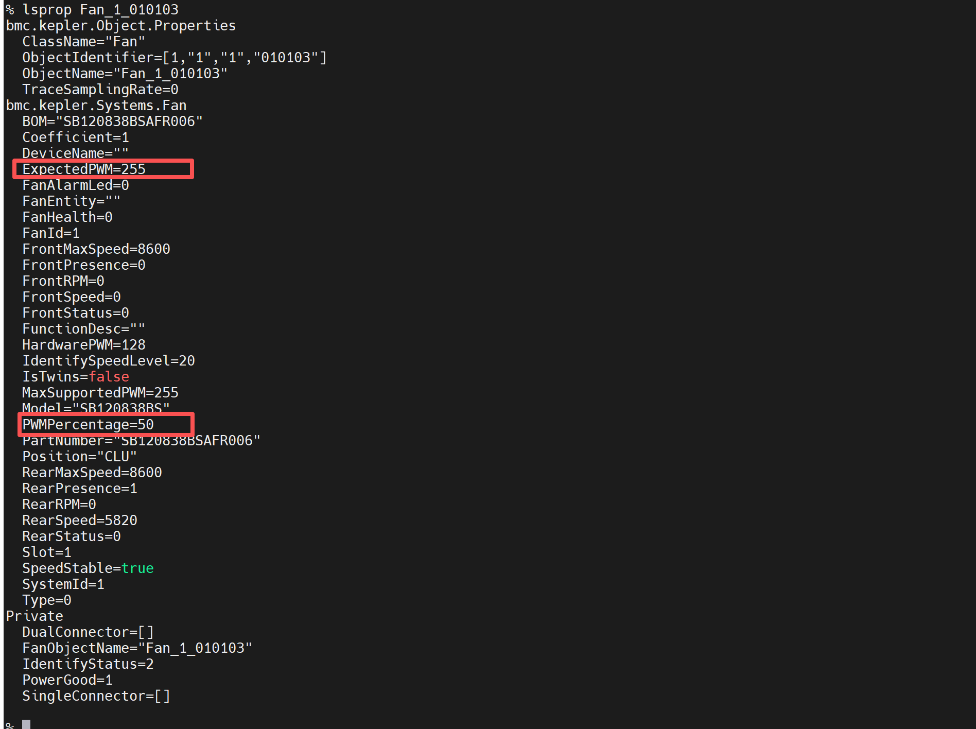 输入mdbctl setprop set Fan_1_010103 bmc.kepler.Systems.Fan ExpectedPWM 255命令后,期望占空比被设置为100了,但是实际占空比还是全局手动设置的值50。转速没有发生改变。