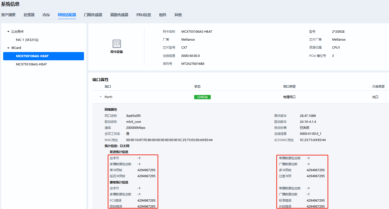 登录BMC->系统管理->系统信息->网络适配器,查看IBCard下IB网卡的端口属性,接收和发送的统计信息为**-1**,或为4294967295(全F)。