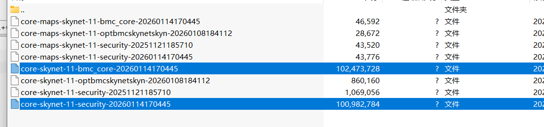 系统中存在多个 core-skynet-11-bmc_core-... 和 core-skynet-11-security-... 文件,时间戳与故障时段一致