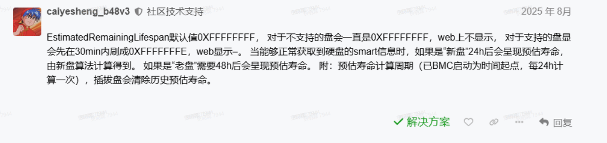| 未完成足够周期的数据采集 | 重启 BMC 或插拔硬盘会重置计时器 | 社区反馈“插拔盘清除历史寿命” |